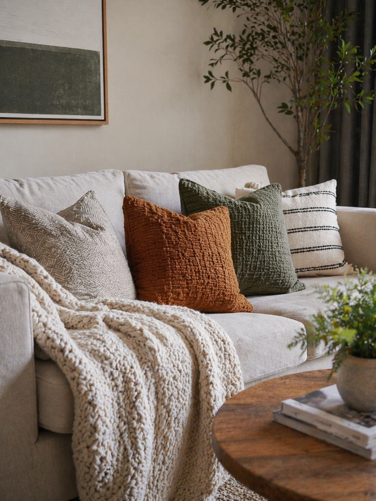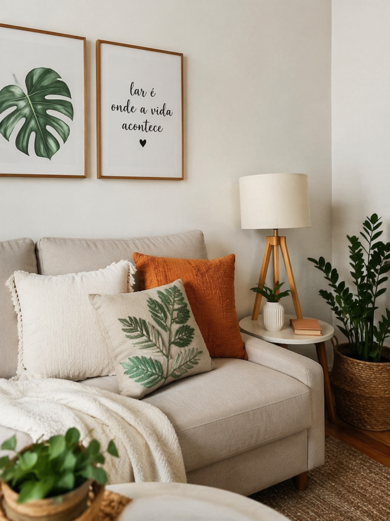 - Dica Pro: Misture texturas. Use capas de linho com mantas de tricô. Isso adiciona profundidade visual e faz com que sua sala pareça planejada por um designer.
