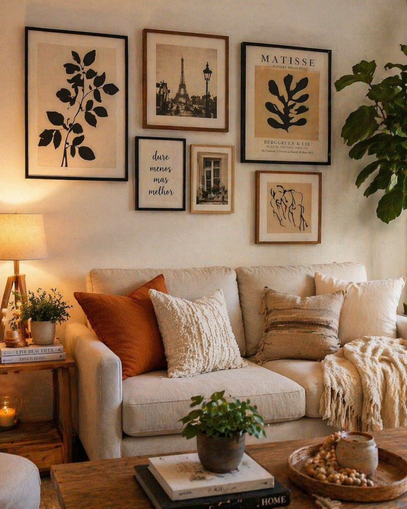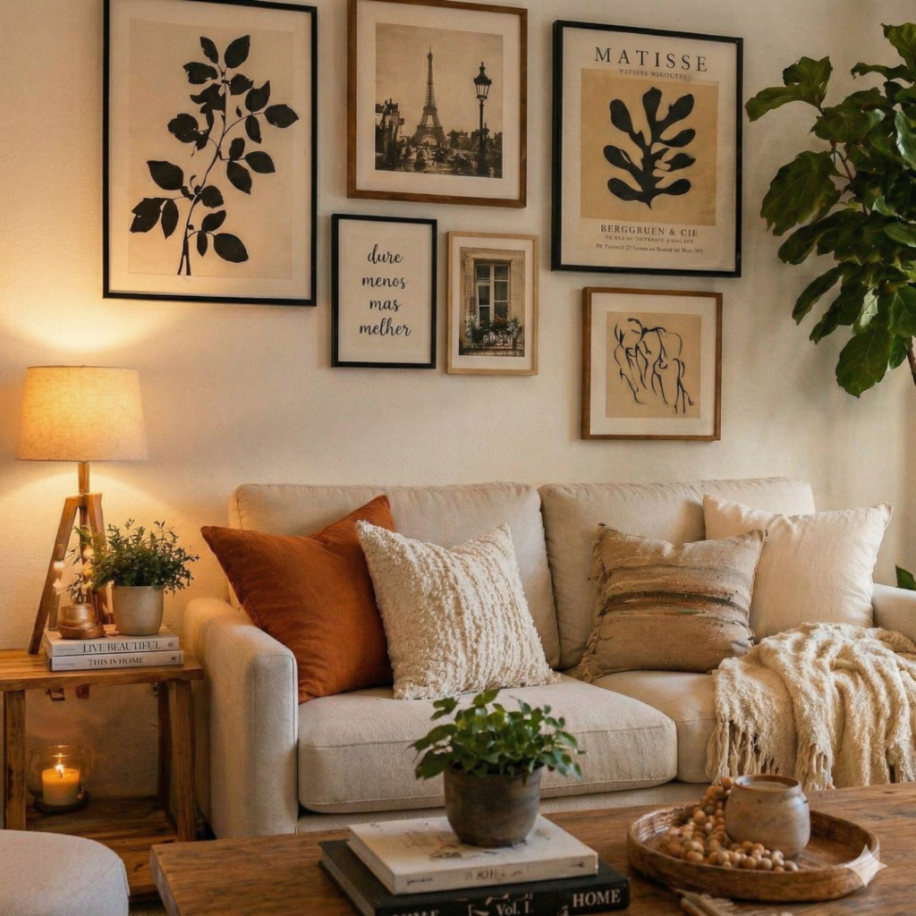 - Achadinho: Compre molduras simples em lojas de departamentos e use impressões de alta qualidade de fotos autorais ou artes gratuitas da internet. Manter uma paleta de cores consistente nos quadros é o que garante a sofisticação.