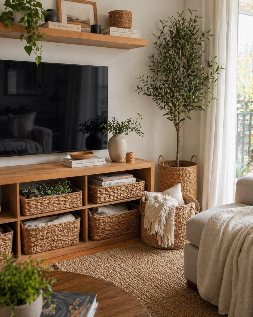 - Como usar: Cestos de palha ou corda de algodão servem para guardar mantas na sala, brinquedos ou até para esconder o vaso de plástico de uma planta. Eles adicionam um toque rústico e chique ao mesmo tempo.